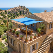 Voile carrée bleue imperméable. Protection UV 95%, installée en 30 min.